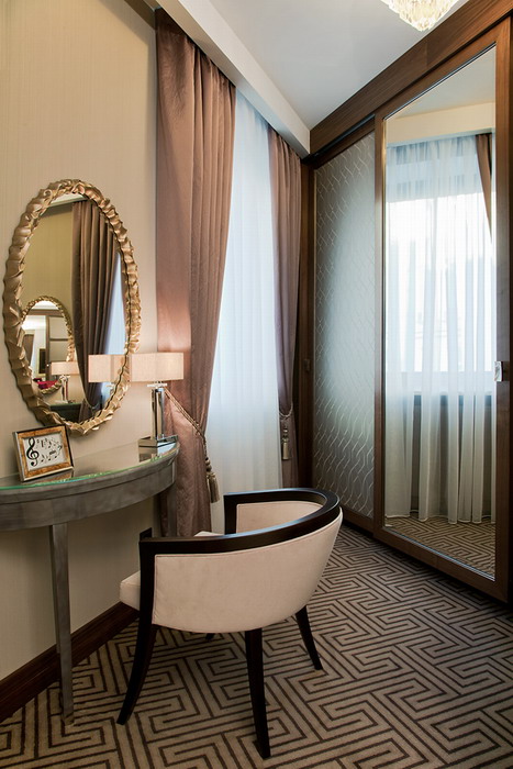 Одной из основных целей дизайнеров было создание номеров элегантных, и вместе с тем уютных и удобных. Планировка некоторых помещений была изменена с целью визуального увеличения пространства и более удобного их функционального использования. Для этого был предложен теплый интерьер с применением материалов бежевого и светло-серого цветов с отдельными яркими акцентами в аксессуарах, первоклассной австрийской мебелью из массива бука и других пород дерева, дубовыми паркетными полами. Ручки мебели – ручной работы, декорированы натуральным филиппинским перламутром. Бельгийские ковры сотканы вручную по рисункам дизайнеров.