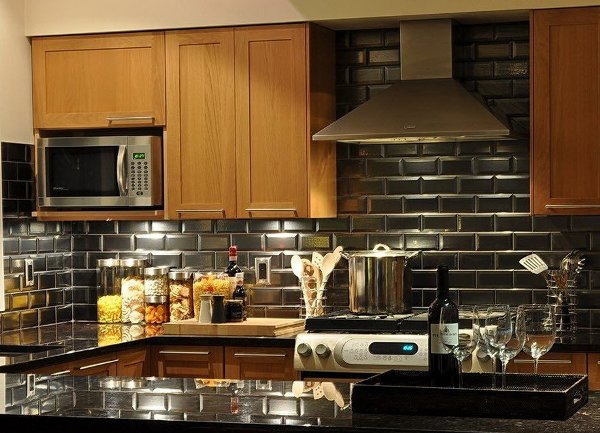 Изменить интерьер помогут светодиодные ленты. На кухне их устанавливают по периметру фартука, монтируют на открытых полках или в нижней части навесных шкафчиков.