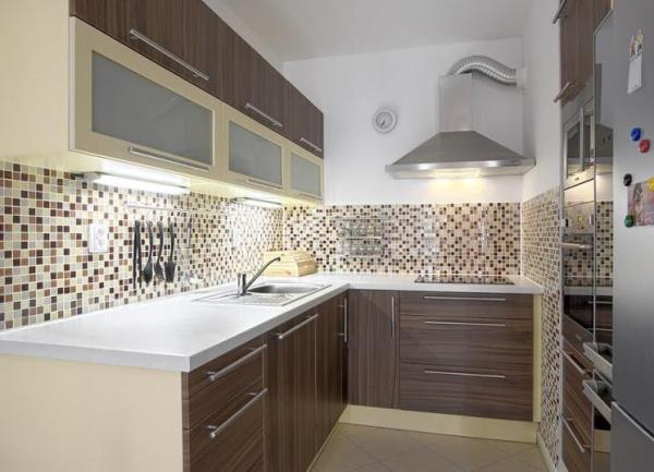 Необычным вариантом отделки стен является укрепление мозаичных плит. Их изготавливают из разноцветного стекла или керамики. Мозаичные элементы, представляющие собой мелкие квадраты, способны украсить интерьер кухни.