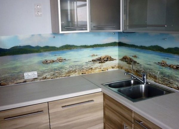 Модной тенденцией стало применение стеклянных панелей для отделки стен. Этот материал изготавливают из закаленного стекла. Поверхность панели не боится перепадов температур. Жирные разводы и капли воды удаляют с поверхности влажной губкой и моющим средством. Такие изделия подойдут для украшения обеденной зоны. Стеклянные панели способны быстро преобразить интерьер помещения.