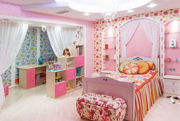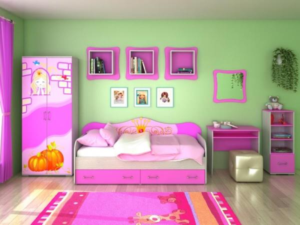 У девочек всегда все самое яркое. То же самое касается комнаты. Основное правило — все должно сочетаться и быть со вкусом. Традиционно девичью комнату оформляют в розовом цвете. Можно использовать сиреневый или бежевый. Комнату можно оформить в стиле спальни для принцессы. Здесь будет кровать с балдахином.