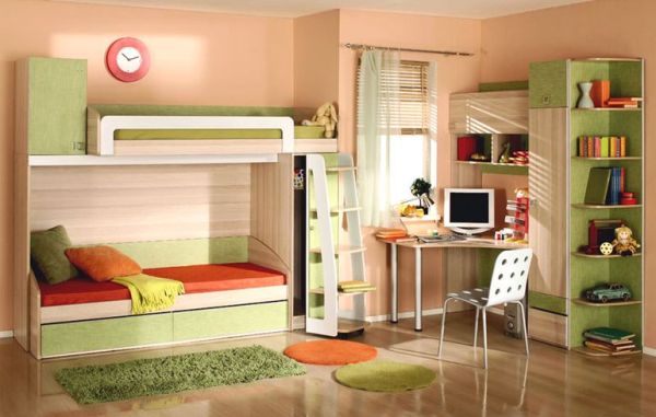 Если в комнате проживает двое детей, то без двухъярусной кровати здесь не обойтись. Она будет занимать намного меньше места в комнате, отдельные кровати для каждого ребенка. Кроме места для отдыха следует распределить также место для занятий и игр.