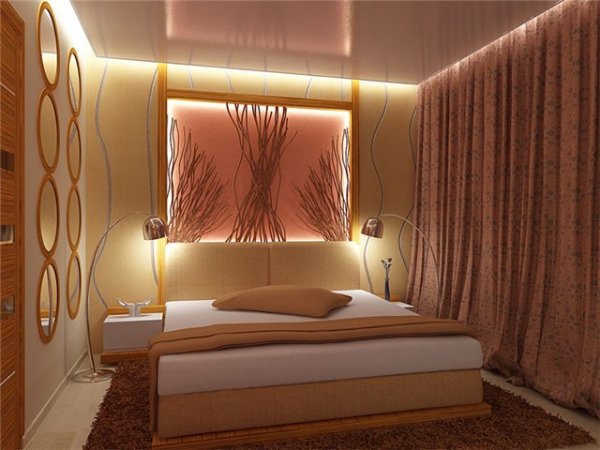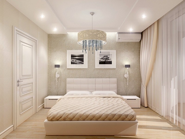 Освещение спальни также зависит от цветовой гаммы отделочных материалов. Нежные пастельные тона обоев увеличивают пространство. Материалы штор или обивки мебели могут быть светлыми, легкими, невесомыми, создавая ощущение свободного пространства в комнате.
