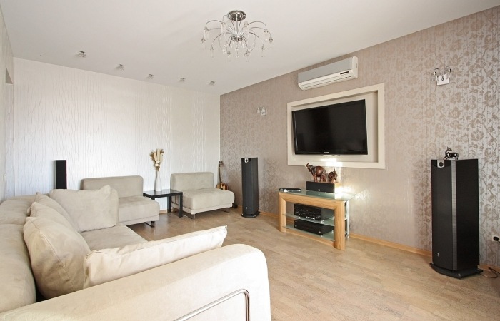 Предметы мебели необходимо объединять в одной коммуникативной зоне, лучше всего – в центре комнаты. Если выстроить их вдоль стен со значительными промежутками между ними, это только подчеркнет огромные размеры и бедность интерьера. Не следует пренебрегать обилием пестрых подушек и текстильных аксессуаров. Такое скопление мелочей дополнительно сократит площадь.