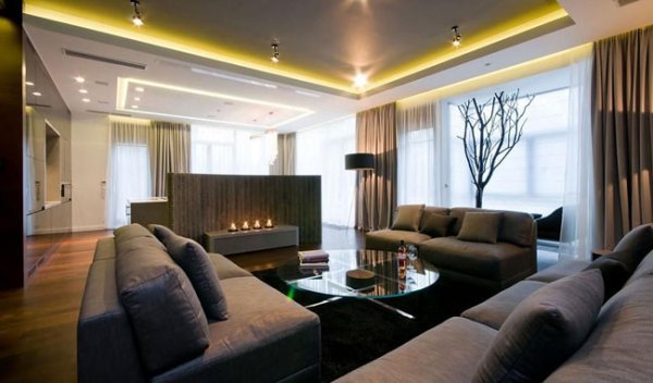 Рельефный потолок или лепнина могут задать тон всему убранству. Молодежь предпочитает многоуровневые потолки с встроенными современными светильниками, скрывающие недостатки. Подчеркнутые контурами детали, смотрятся изысканно, придавая помещению особый шарм.