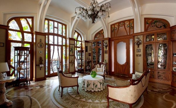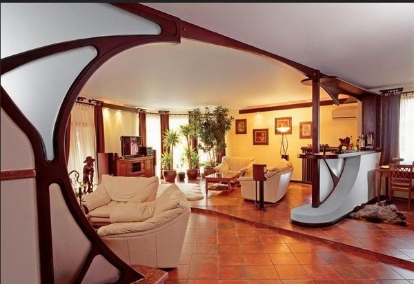 Оригинально смотрятся межкомнатные двери с фигурными вставками из стекла. Кровать в спальне или ванную можно поставить на подиум. Уголок отдыха с креслом у камина, также можно устроить на подиуме. Резких углов и переходов быть не должно! Модерну присущи обтекаемые формы.
