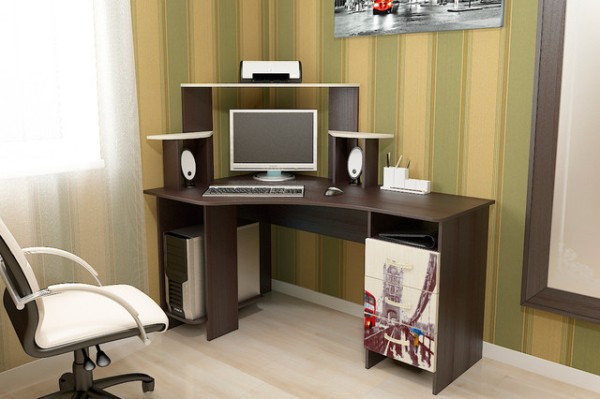 - Материал: покупая бюджетный вариант, нужно удостовериться, что все поверхности компьютерного стола оклеены специальной пленкой, препятствующей выделению в атмосферу паров вяжущих веществ, присутствующих в ДСП. Хорошо подобранная пленка, имитирующая структуру дорогой древесины, может превратить компьютерный стол в экстравагантную деталь интерьера.