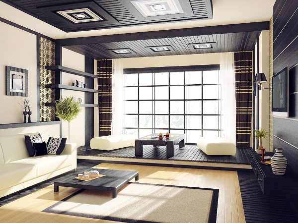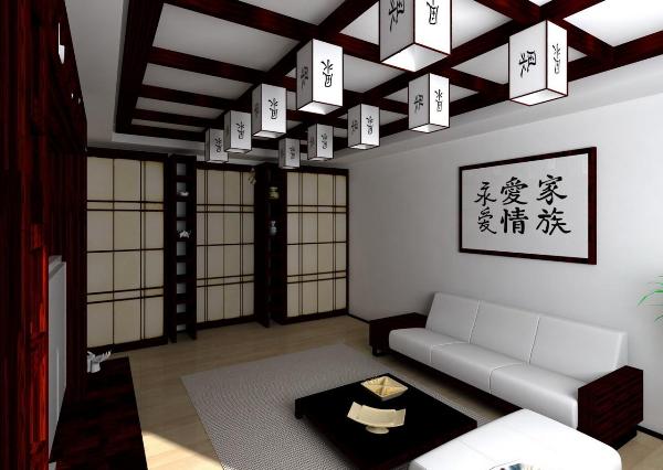 Цвета — здесь лучше выдержать в спокойных, приглушенных и теплых оттенках, таких как светлые, например, бежевый, светло-оливковый, белый, так и темные — шоколадный или темно-серый. А чтобы вместо извечного покоя не получилось уныния, можно добавить немного яркого – синего или красного. Важно – цветов должно быть не более трех одновременно, и чтобы они сочетались друг с другом по оттенкам. Потолок достаточно просто окрасить белой краской без особых изысков, но при этом там не помешают концентрические квадраты или прямоугольники из дощечек контрастного цвета — черного, шоколадного или темно-серого. В центре квадрата помещается светильник. Фонарь из рисовой бумаги сгодится в качестве люстры.
