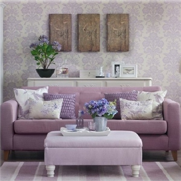 Вариации палитры от яркого фиолетово-бордового до нежного лавандового позволяют применять его в отделке любой комнаты, кроме того, правильно подобранный оттенок может визуально удалить или, наоборот, приблизить какой-либо объект. Беспроигрышным вариантом является сочетание с белым цветом. Он гасит экспрессивную яркость, добавляет грациозную лёгкость. Стильно и гармонично смотрится сочетание с зелёным, приглушённым жёлтым, серым, а также со сходными по спектру цветами — бордовым, розовым, голубым. С осторожностью следует применять огненно-красные и чёрные тона.