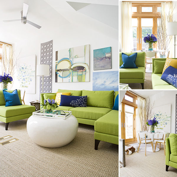 - Для гостиной очень подойдет сочетание зеленого, белого и бирюзового, что придаст интерьеру завершенность.